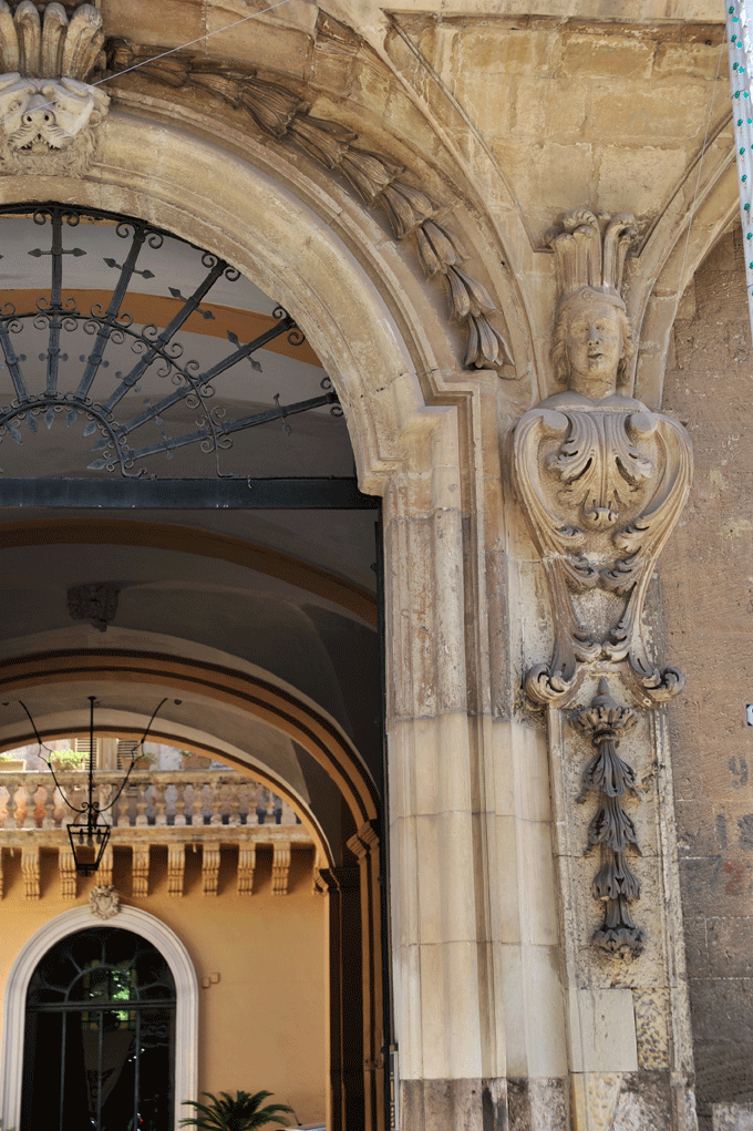 The combination of architectural elements and ornamental motifs is completed by the caryatids, half-length decorative figures typical of the late Renaissance, which play the fundamental role of supporting part of the building. Their presence, on the side of the entrance door, welcomes the visitor to the interior of the building. Passing through the entrance arch, you reach the main hall, which leads to a delightful garden, now considerably reduced due to the modernisation work that the palace has undergone over the years.